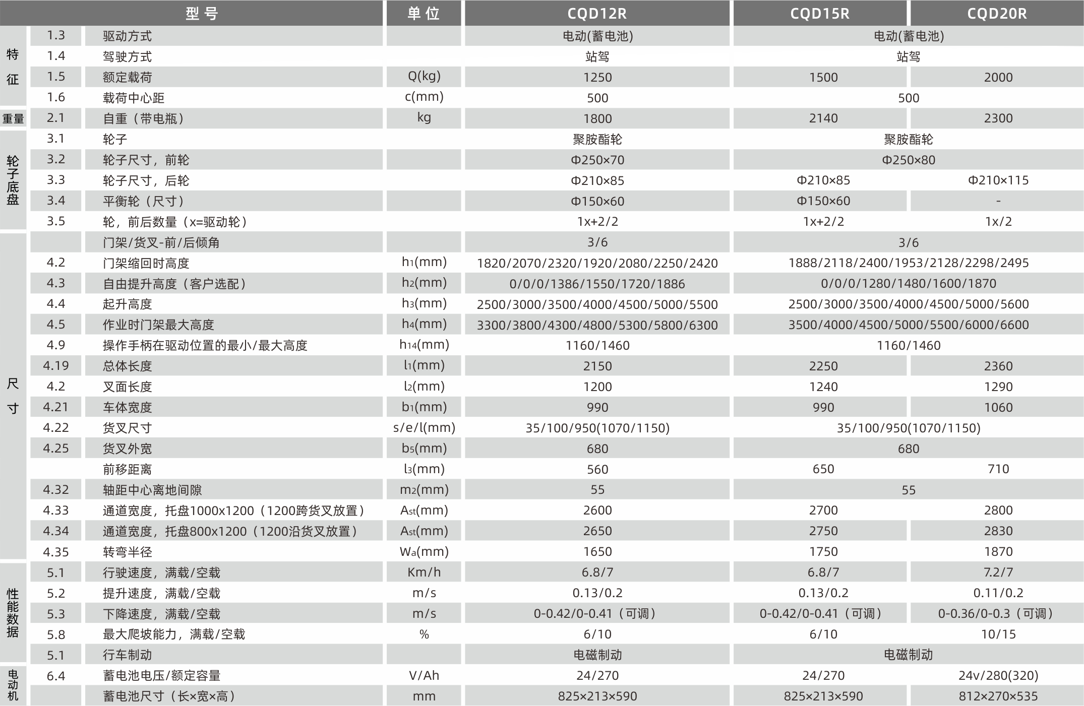 内置充电器、全自由提升、货叉侧移,可作为客户的选配,门架起升高度为2.5米至5.6米,承载能力由1吨到1.25吨;